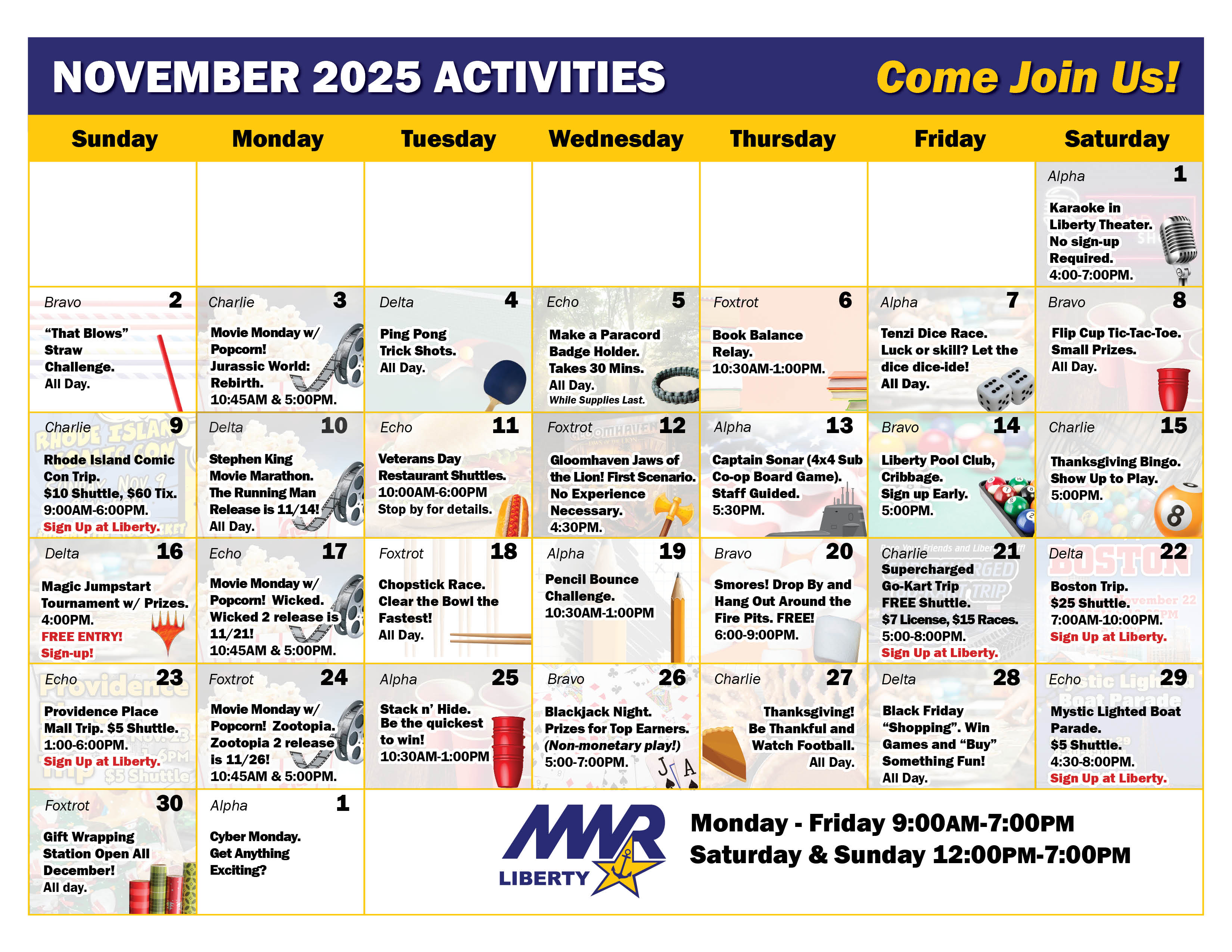 Most events at the Liberty Center are free of charge. A nominal fee is charged for some activities and trips off base.