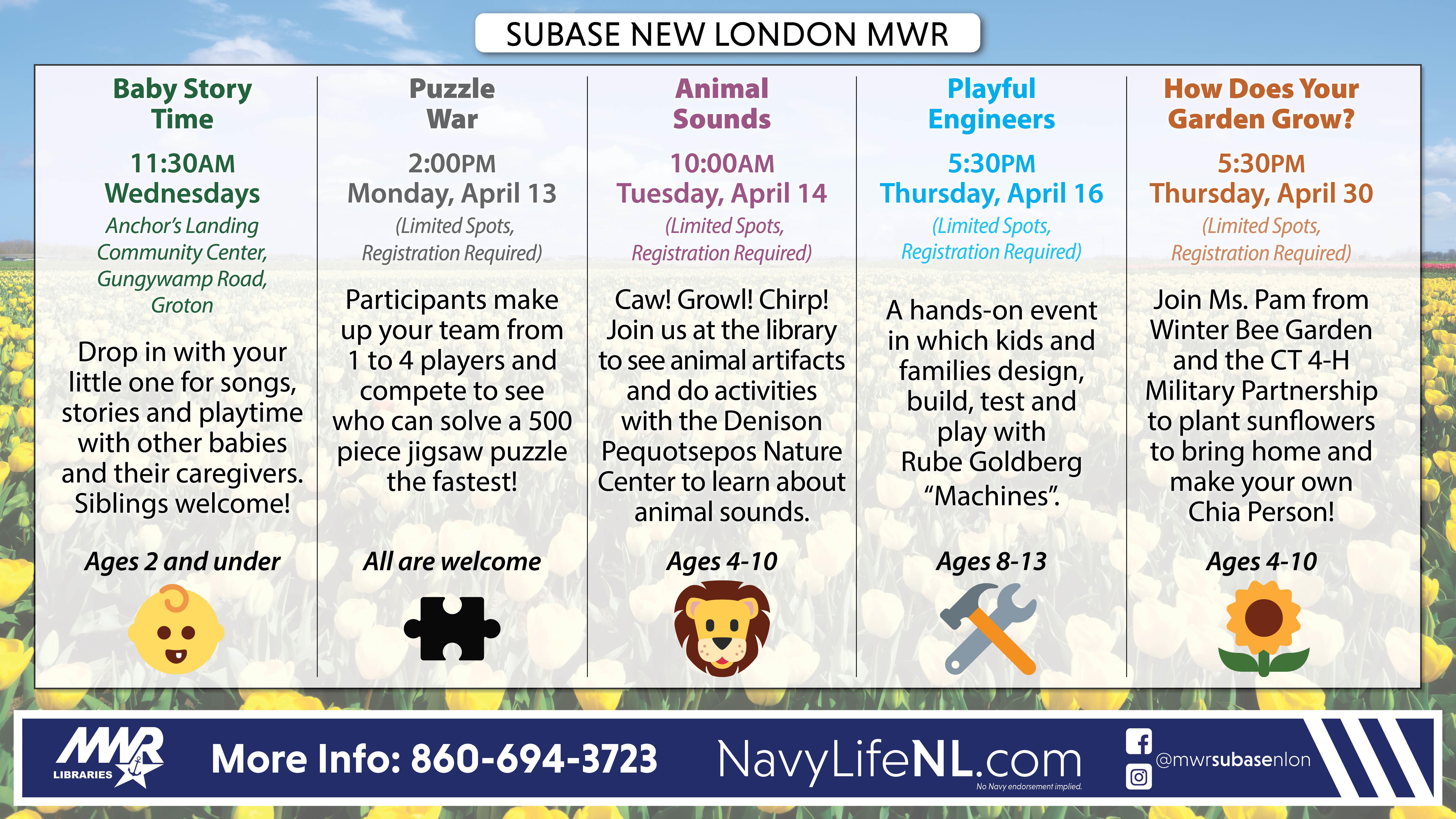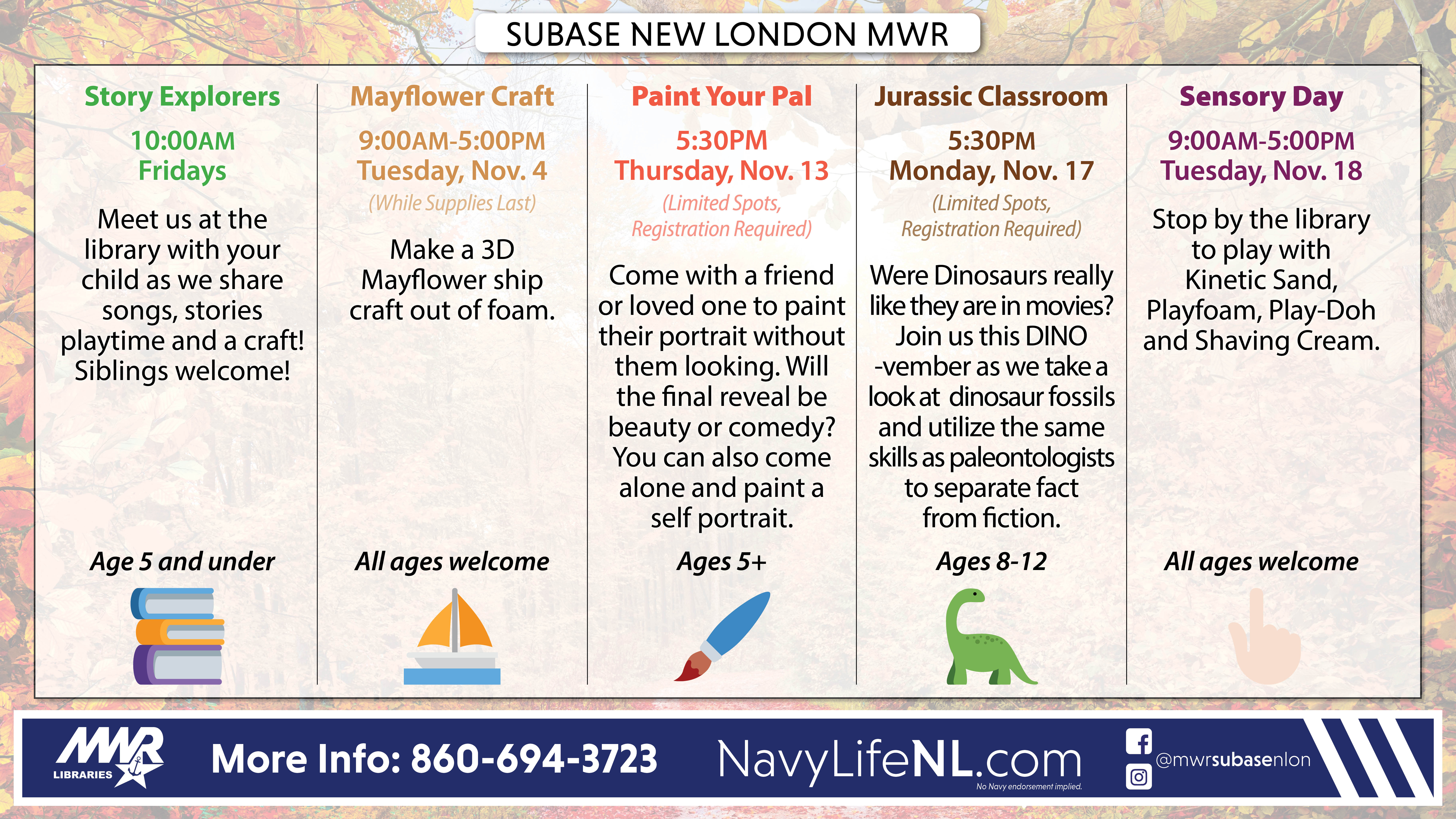 SUBASE Library is known for its wide variety of programs for all ages, including the Summer Reading Program, United Through Reading, storytimes and so much more. The Library has two more spaces, the conference room and multi-purpose room, which are great for FRGs, training, homeschool meet-ups, meetings and many Library programs and events. Call us or stop by to reserve the room! 860-694-3723